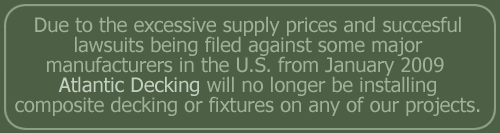In many cases this is simply not true and serious problems have arisen after just a few years of being exposed to the elements. Composite decking material is still very much in its infancy and no doubt manufacturers will attempt to overcome some problems. In the mean time Atlantic decking can no longer recommend the use of composite decking in the UK for these reasons and will no longer be stocking, supplying or fitting composite decking. One particular example can be found here |